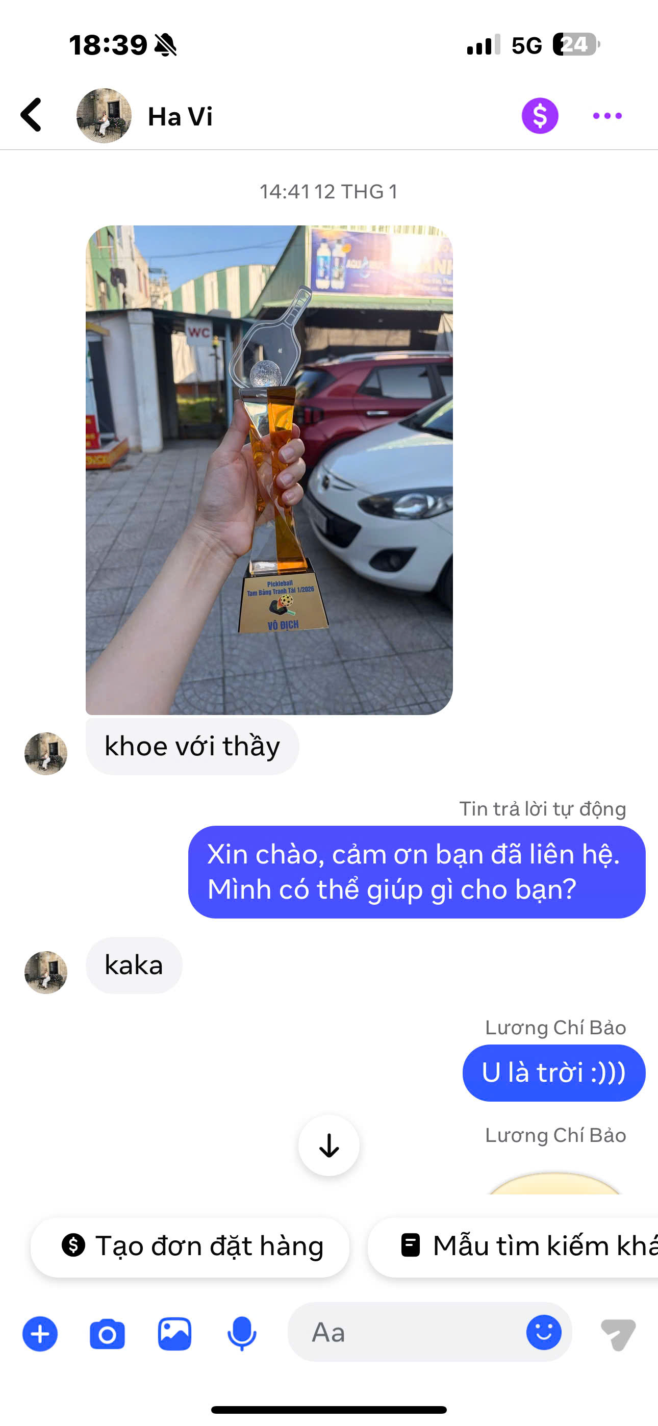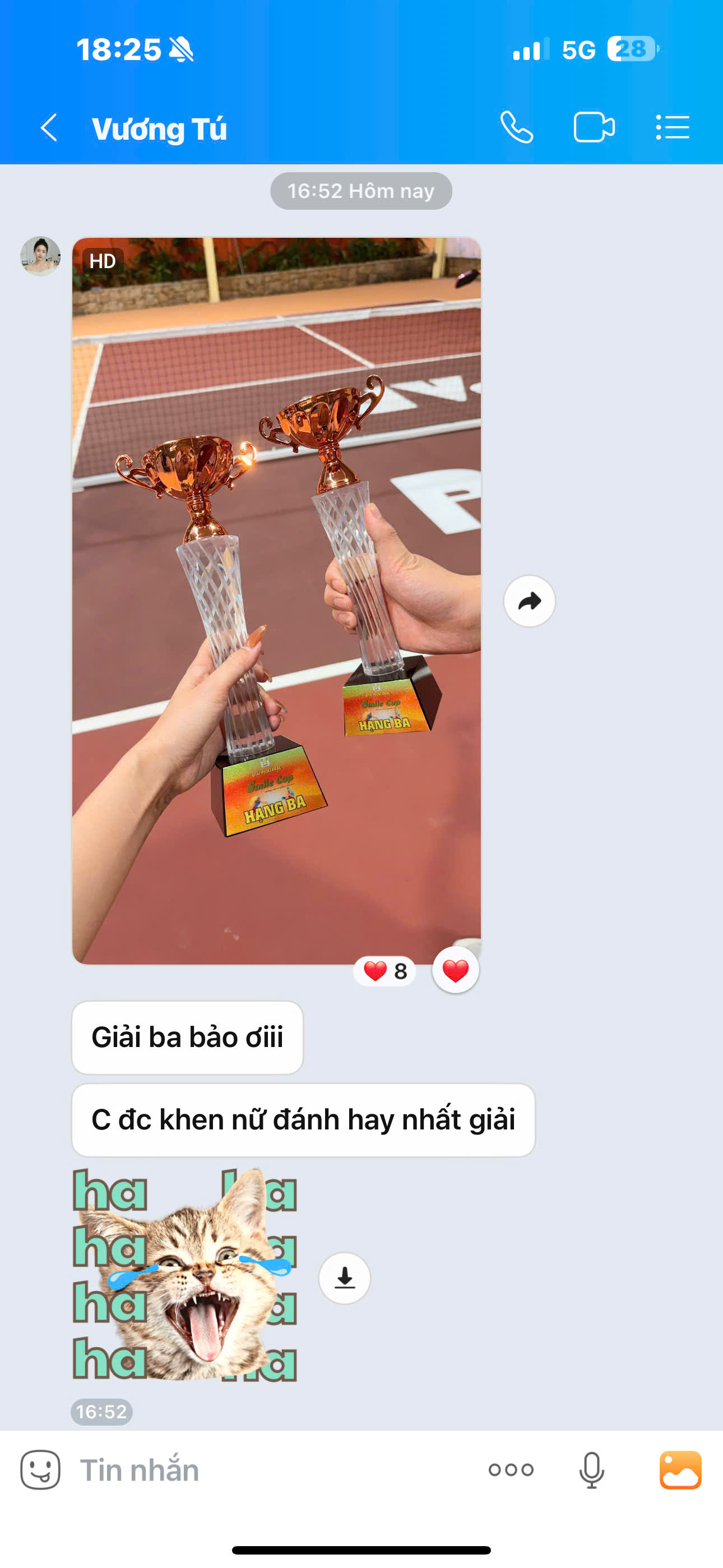 "Cảm ơn Bảo đã hướng dẫn cho chị những cú quả đầu tiên. Tuy rằng giải nội bộ 24 người thôi! Mà từ một người chỉ đứng ngoài lượm banh. Hôm nay chị đã đánh được những đường bóng cơ bản. Xin cảm ơn thầy Bảo nhiều!