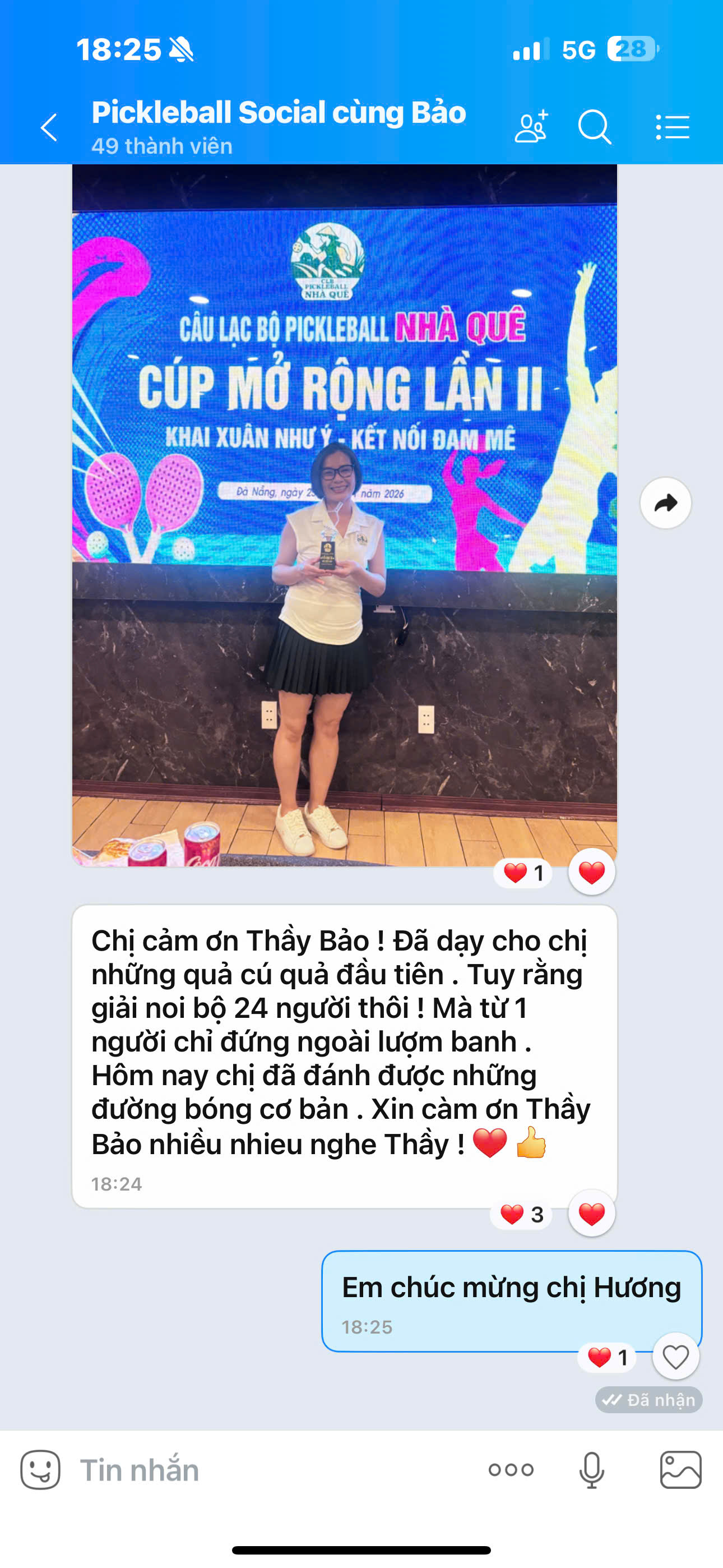 Sau khi học, bạn được tham gia cộng đồng Pickleball cùng Bảo : chia sẻ video luyện tập, hỏi – đáp kỹ thuật, tìm sân chơi gần bạn.