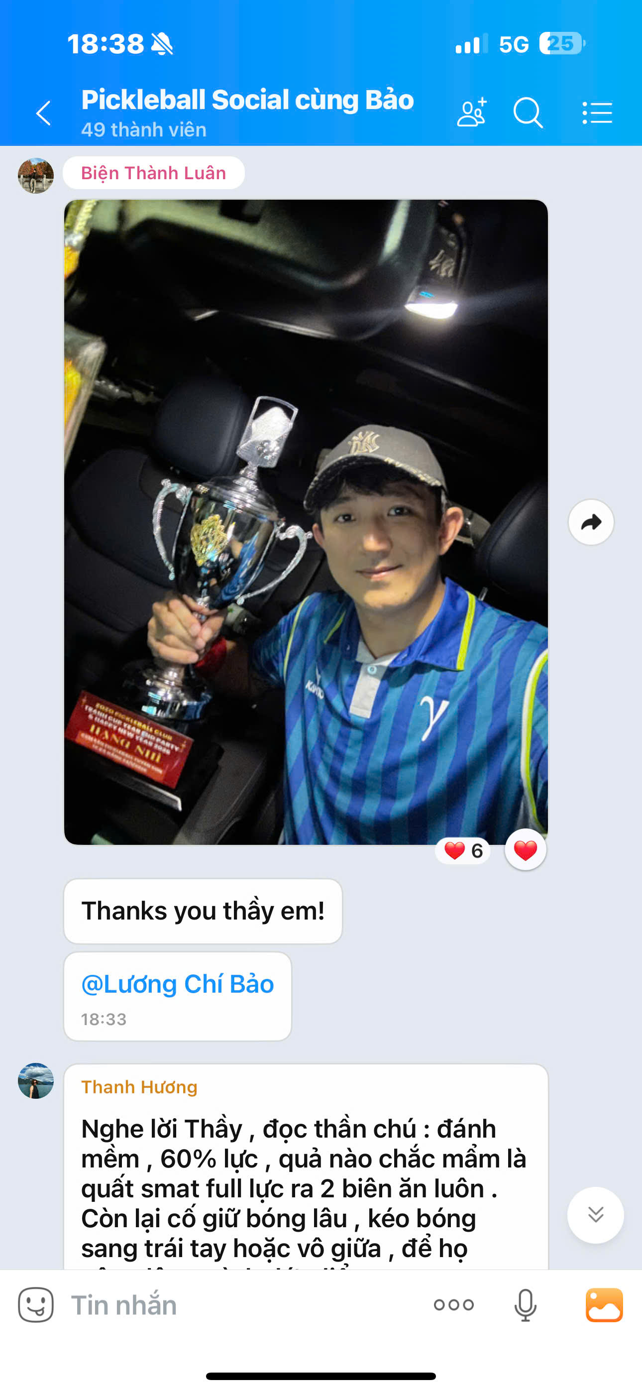 Sau khóa học, bạn được tham gia nhóm riêng – nơi mọi người chia sẻ tiến trình, hỏi kỹ thuật, góp ý bài tập và rủ nhau ra sân đánh thử.